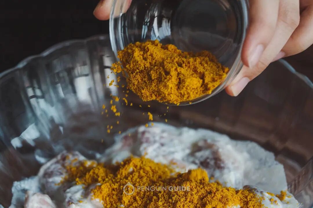 咖喱部分,我们推荐不倒翁牌的韩式咖喱粉,这款咖喱粉会稍微带一点辛辣味,和酸奶很搭,粉类用来腌肉也会更入味一点。