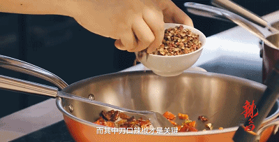 花椒和切碎的干辣椒,一起下油锅翻炒。