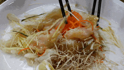 生鱼被整齐地切薄后摆放在盘里,精致得让人不舍动筷,但当淋上风味醇厚浓郁的豉油时,大家都将寒暄时的斯文彻底扔在一边,皆起筷捞起鱼生,并异口同声地说“捞起,捞起,风生水起!”