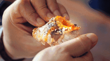 金黄的蟹膏将蟹壳顶爆,轻轻一掰,膏体油润诱人,肉质雪白,紧实细腻,入口有微微甜味,香味浓郁。这种浓郁的香味让蔡澜在日本时念念不忘,虽有体大味甜的日本蟹吃,但论起味道来,大闸蟹是一流。甚至手上那股三天都洗不去的蟹腥味也是好吃的证明。