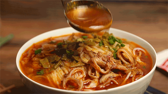 酸辣肚片、酸菜肉片、木耳肉丝、猪脚、红烧牛肉、肥肠,这些浇头一股脑儿地都放在大锅里慢炖,所有食材的香味便瞬时都融合在了一起。