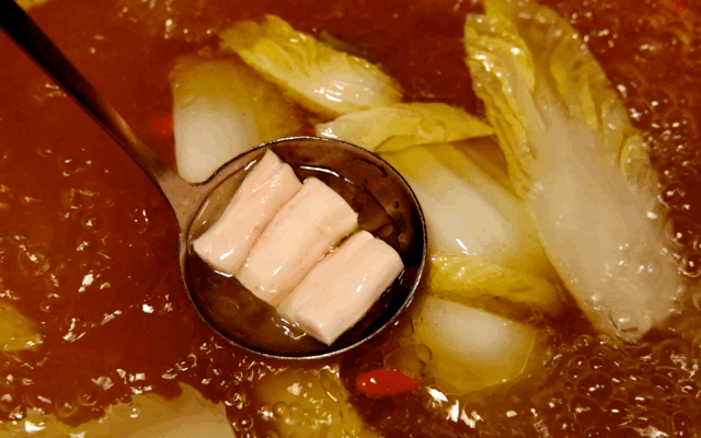 如果牛肉火锅,切法会稍厚一些,在锅中涮一涮再吃,汤汁会令凉片的风味更加突出,柔柔软软的好像在吃高级肥牛。