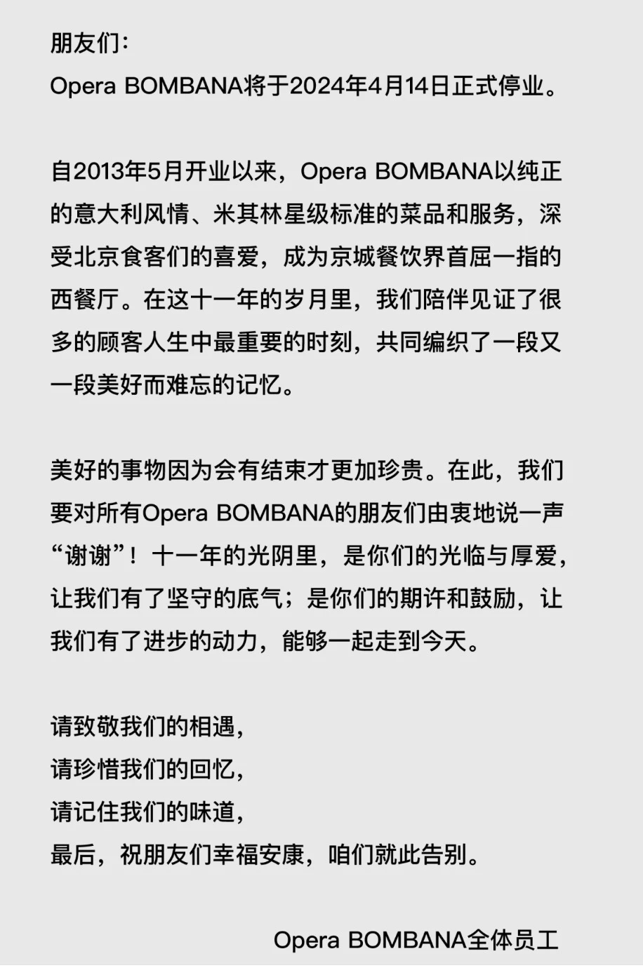 ▲ Opera BOMBANA的告别信。图 / Opera BOMBANA公众号