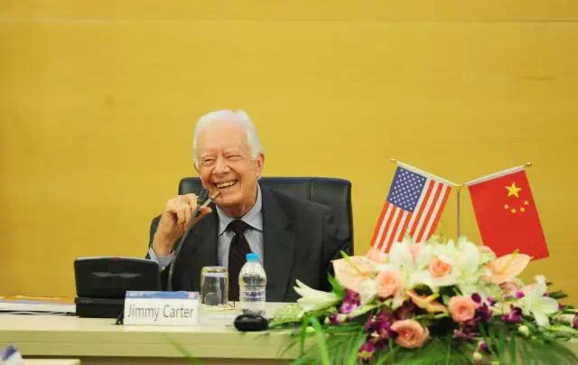 当地时间12月29日,美国前总统吉米·卡特当天在美国东南部佐治亚州家中去世,享年100岁。卡特于1977年至1981年出任美国第39任总统,在其任内中美两国正式建立外交关系,被认为是其白宫岁月中最重要的历史贡献之一。此后他也长期关注中国,直到生命的最后时刻,他依然在为中美关系献力。“我与中国的关系,是我人生中最为精彩的一笔。”在2015年出版的自传《充实的一生:九十岁回忆录》中,卡特曾如此感慨。四年总统任内,他因故未能访问中国,这成为当时最大的遗憾。为了弥补遗憾,他卸任后十多次访华,成为中美之间的“交流大使”。卡特最后一次访华是在2014年9月,行程包括参加庆祝新中国成立65周年、中美建交35周年和自己90岁生日的活动。而他与中国领导人的最后一次见面是2012年12月13日,中国领导人在中南海接见了他,并强调,新形势下,中美双方要不畏艰难,勇于创新,积累正能量。