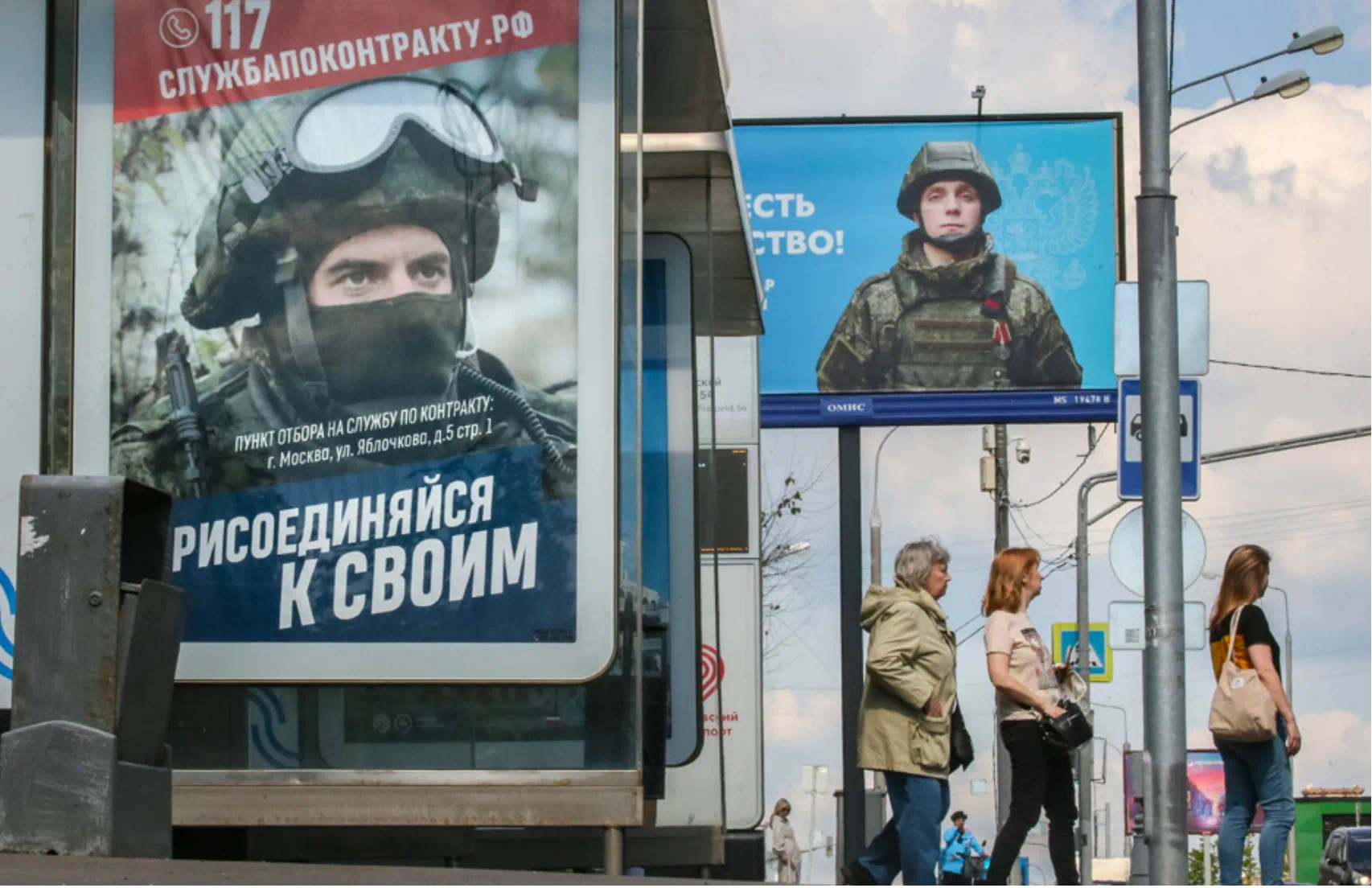 2024年5月21日,俄罗斯莫斯科,人们站在公交车站等车,旁边是一则征兵广告。