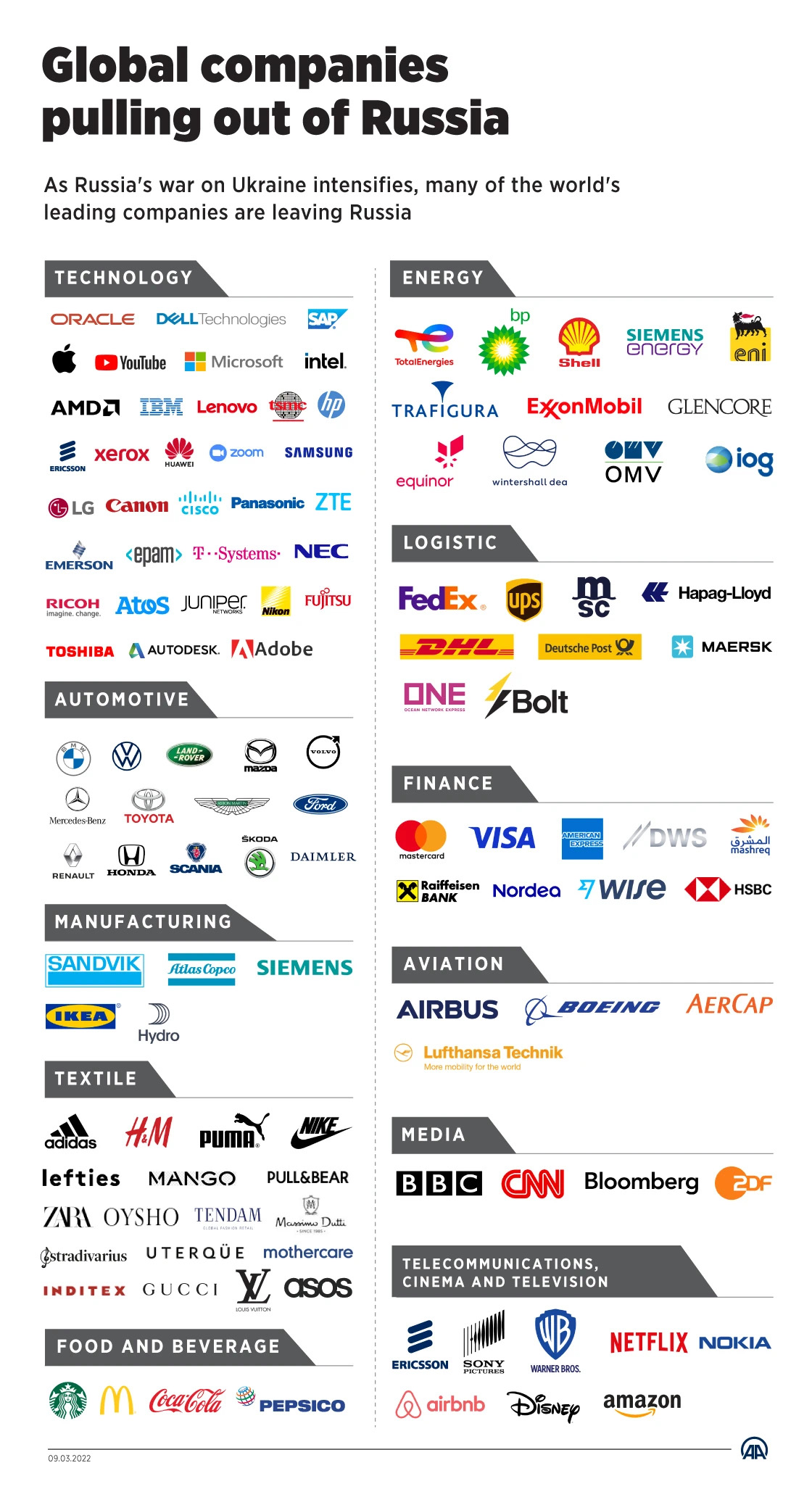 自开战以来,越来越多公司宣布停止在俄罗斯的业务。