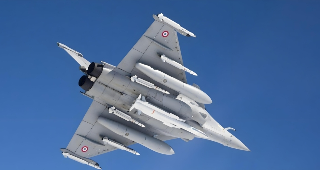 法国“阵风”战斗机机腹下方携带了一枚ASMP-A超音速核巡航导弹,导弹射程约500公里。