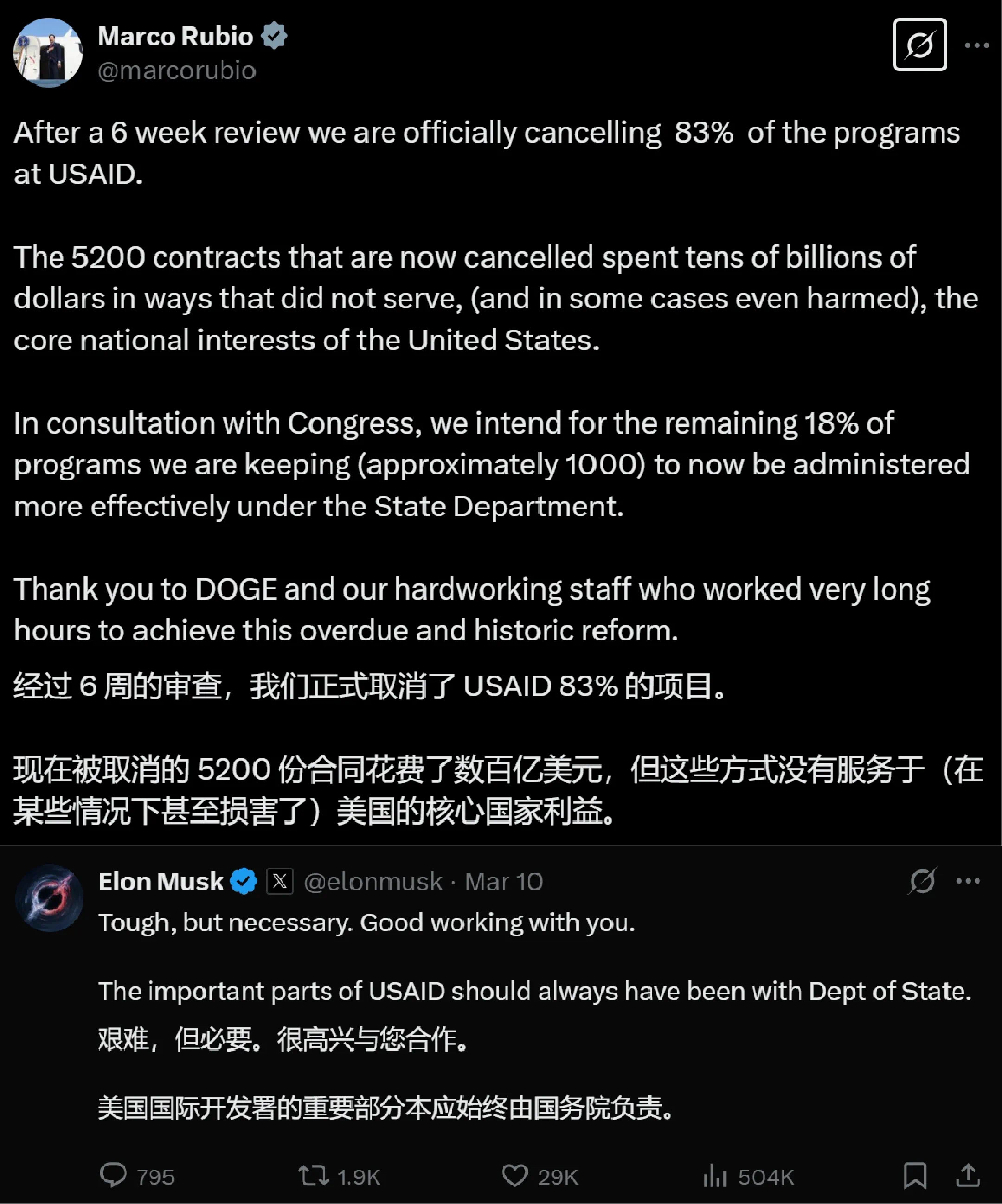 之后,二人在社交媒体上演了“握手言和”。鲁比奥在马斯克旗下的社交平台X上发帖称,他已完成对美国国际开发署(USAID)合同的审查,撤销了其中83%的项目,理由是这些合同未能推进“美国的核心国家利益”。马斯克回复帖文说,“艰难但有必要,和你合作很愉快。”