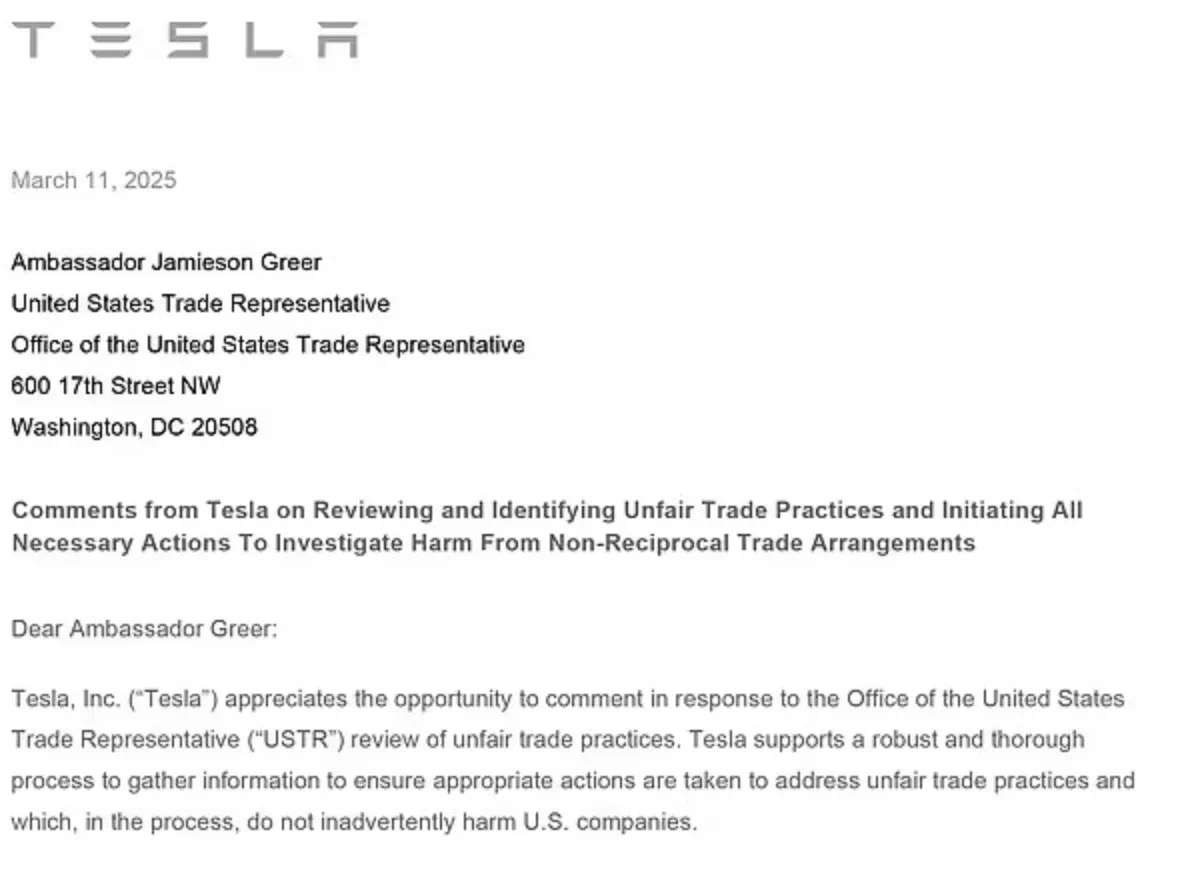 ◆特斯拉公司3月11日向美国贸易代表发送了一封没有署名的信,暗示该公司可能会受到关税战的伤害。值得一提的是,这封信是由特斯拉的副法律总顾问米里亚姆·埃卡布(Miriam Eqab)上传至美国贸易代表办公室网站的,只有公司信笺抬头,没有署名人。外界猜测,信上没有署名,是因为公司里没人想因发这封信而被解雇。
