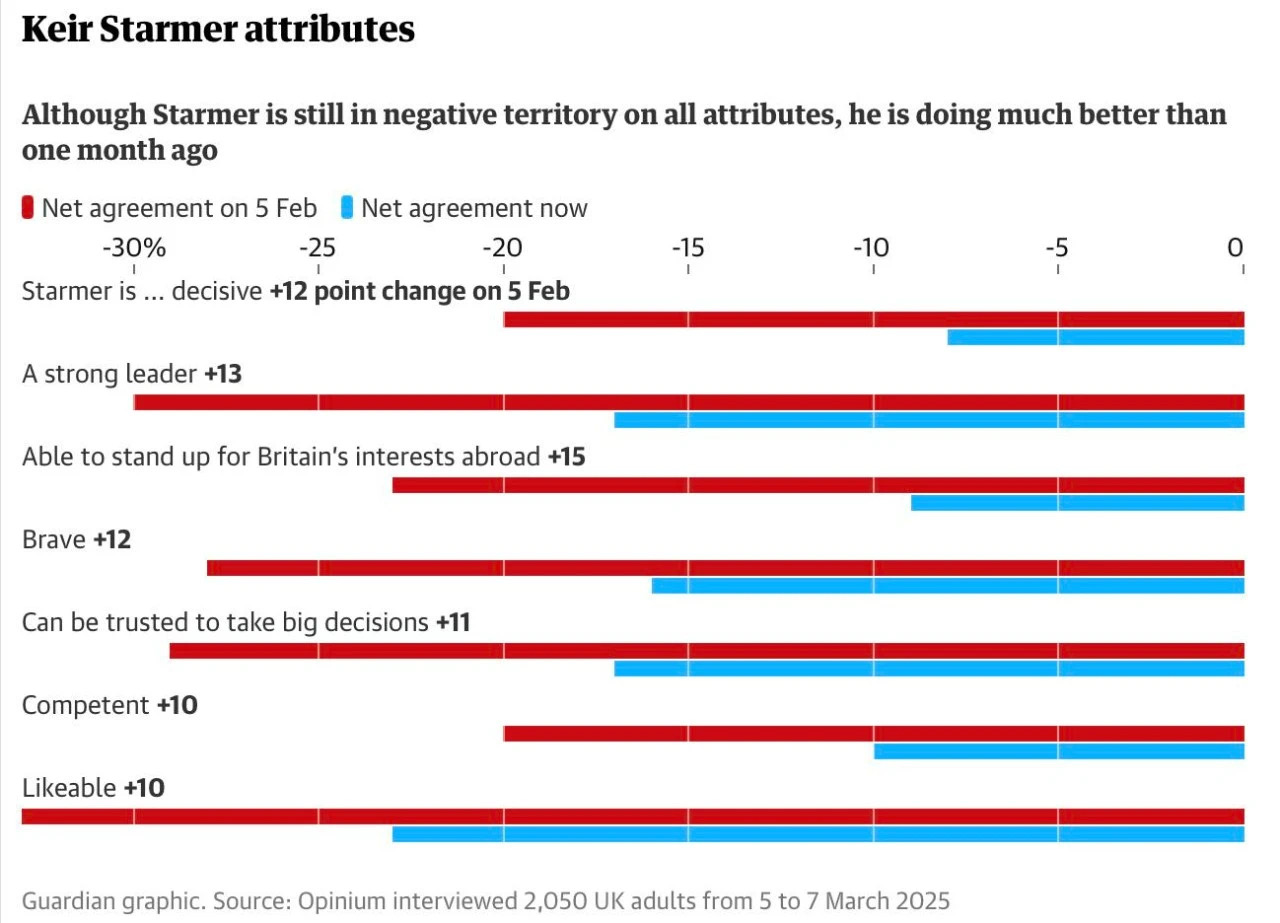 值得注意的是,这已是斯塔默自去年9月以来的最高支持率了。舆观调查公司指出,今年2月中旬至今,斯塔默的好感度“止跌回升”、上升了6个百分点,直接原因不难理解:特朗普颠覆了美国对俄政策后,斯塔默成功访问华盛顿、一度化解“关税危机”,并在欧洲扛起援乌大旗,得到国内民众的认可。