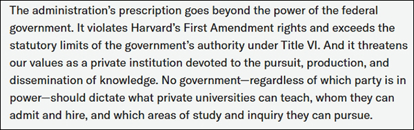 哈佛大学校长艾伦·加伯(Alan Garber)14日在一封声明中写道,政府的指示超越了联邦政府的权力。它侵犯了宪法第一修正案赋予哈佛大学的权利,也超出了《1964年民权法》第六章赋予政府的法定权限。