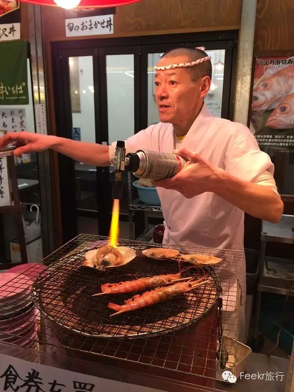走到这家店的时候,我被老板深深的吸引住了。光头老板带着头绳,不停的叫哪里有这么便宜的海鲜啦,哪里有这么新鲜的海鲜啦,现买现烤最好吃啦~~我就乖乖掏出钱包,买了一个1000日元的套餐,包括2个大虾,3个贝壳(2个品种)。他现场用喷枪烤熟,我眼看着火烧的贝壳卷了起来,那种气氛一定要现场看到才能感受到。↓↓↓