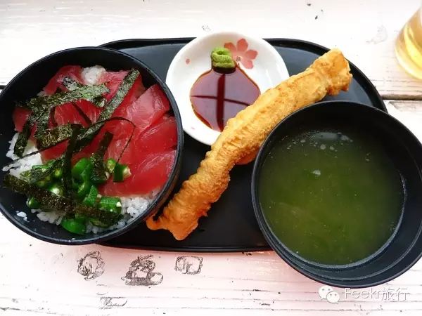 还没进门就看到了价格牌,金枪鱼套餐600日元(30元),综合海鲜饭1000日元(50元),统统是市区的半价好嘛。↓↓↓