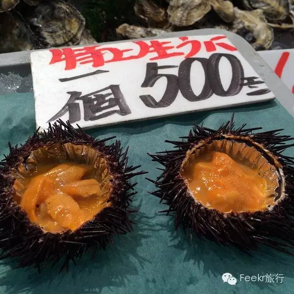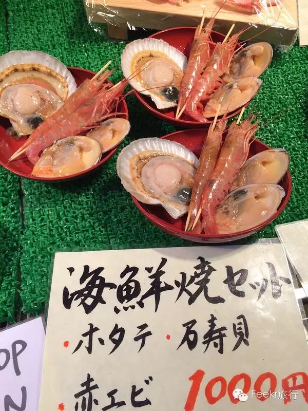吃完这家继续走,有剥好的甜虾和海胆。在国内也吃过,价格贵不说,虾肉不甜,海胆发臭。这里的海鲜都是当天捕捞的,价格也很平易近人。甜虾和海胆各500日元(25元),又用掉了1000日元。↓↓↓