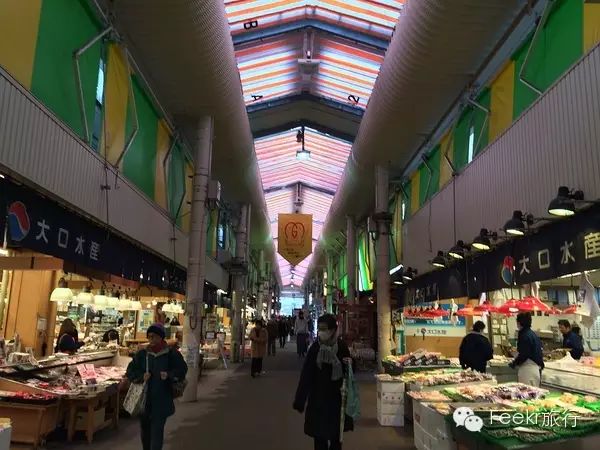 去日本金泽逛无聊透顶的兼六园还被淋雨后,一定要找吃的安慰一下。近江町市场就是这样一个接地气的地方。走在带顶棚的市场里,两边都是不停叫卖的店铺,难怪这里叫“金泽的厨房”。