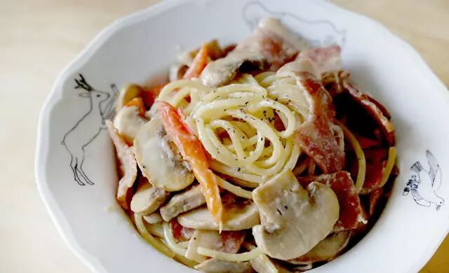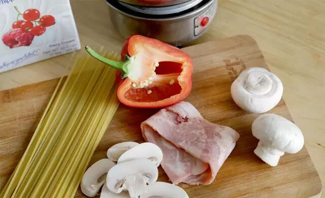 | 食材 | 口蘑 | 3朵 培根 | 2片 红椒 | 1/4颗 意面 | 一小把 淡奶油 | 100ml 橄榄油 | 适量 盐 | 适量 黑胡椒 | 少许