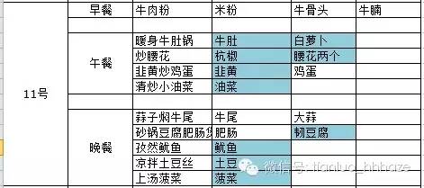 有一年爸妈来过年,三餐都在家里吃,我就把每一顿做的菜和需要的材料都列了一个表格。而且还会把要补货的食材用颜色标记出来,不容易遗漏。