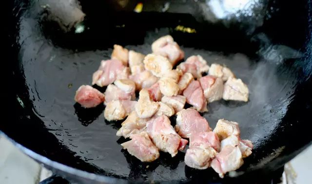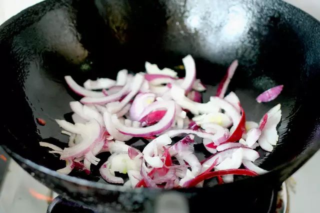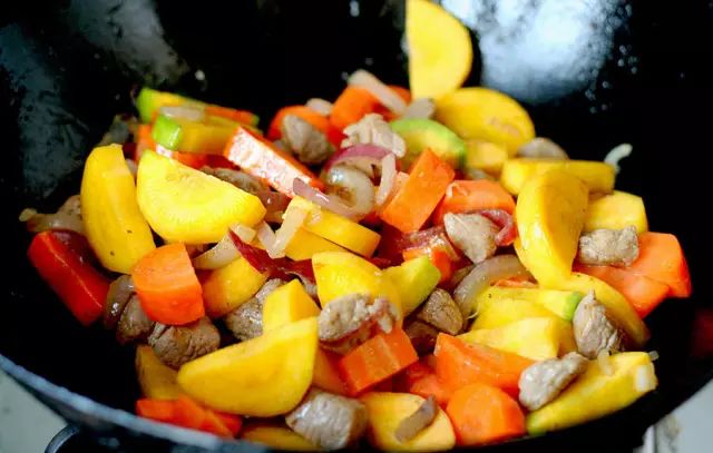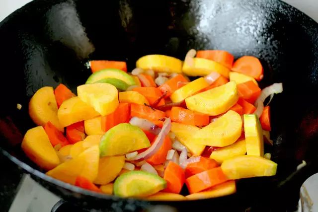 ❷ 炒制配菜:热锅凉油,下洋葱丝炒至变软,然后下胡萝卜、黄萝卜一同翻炒均匀,此时可按口味加适量盐,翻炒3分钟左右盛出备用;锅中重新加入少许油,下羊肉翻炒至变色,加入适量孜然粉和盐炒匀,然后下炒好的蔬菜翻炒均匀;