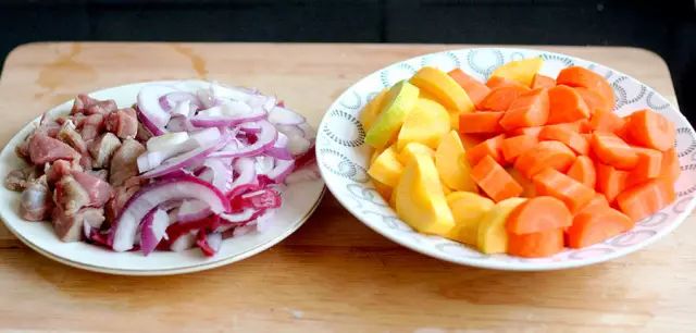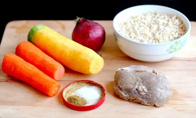 ❶ 处理食材:大米和燕麦米提前1小时浸泡,羊肉切成拇指大小的块,胡萝卜、黄萝卜切丁,洋葱切丝;