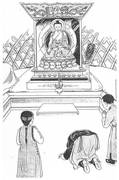国民教育课本上的配图,“诵经礼佛”。