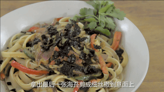 把炒好的酱汁配菜淋在意面上面,撒上海苔碎加点香菜就完成了,是不是很有食欲了呢,不得不说这味道确实为之震惊啊。过节放假回家希望大家可以试试做这道意面给父母吃。