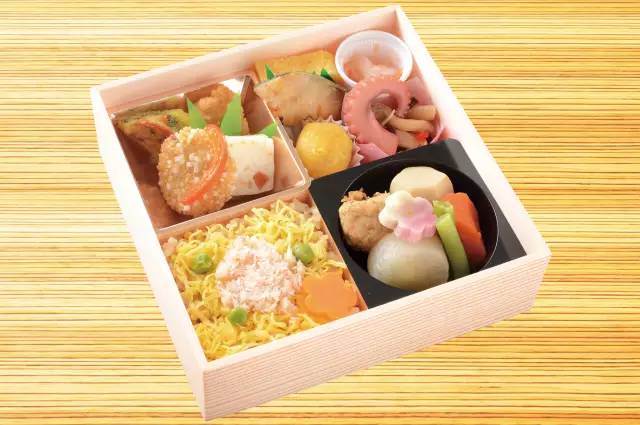 使用甜醋腌制过的河豚皮,虾、鱼子等大海的特产全部被收入这款便当中。此外,寿司中还包括鸡蛋、香菇、河豚肉等。