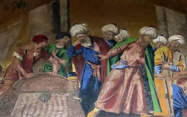 在那道拱门上面,能看见画中有几个裹着白色头巾的人,有的捂着脸,有的捂着鼻子,好像是嫌弃最左边两个人的味道。其实他们嫌弃的不是那人身上的味道,而是他们面前篮子里的猪肉。