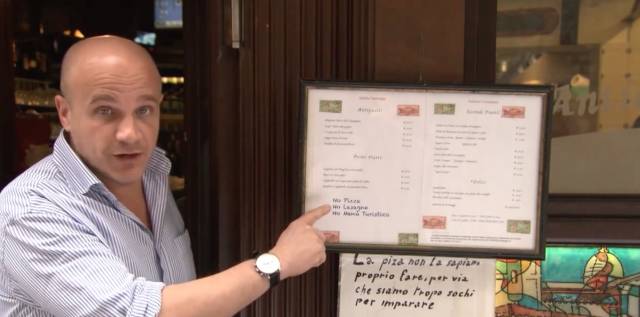 当然,如果你懂意大利语,还会在旁边看到一行小字,“之所以我们没有比萨饼,是因为我们太笨了,不会做那玩意儿。”