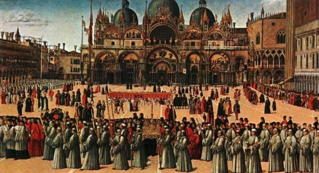 《圣经·新约》里面有一部分叫《马可福音》,就是这个圣·马可写的。因为《新约》里提到圣·马可将被葬于威尼斯,所以威尼斯人决定建一座圣·马可大教堂。但是光有建筑还不行,必须得有圣·马可的遗体,才能合情合理。后来他们听说圣·马可尸体在今天埃及的亚历山大,于是就派了两个人去偷圣·马可的骨头。骨头偷到了,但是丢骨头的亚历山大城也马上发现了这件事,拦截了所有港口船只,挨个搜查。后来果然查到了窃贼那艘船,准备掀开窃贼的篮子,看看里面有没有骨头,结果看到的是猪肉。然而,那时候北非的许多警察都是穆斯林,一见猪肉,扭头就跑。其实猪肉下面,藏得就是圣·马可的骨头。