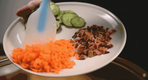 胡萝卜和培根切粒,培根需要过锅剪一下、青瓜则切片,喜欢洋葱的可以加点洋葱进去,洋葱的感觉较甜,和土豆泥也是很搭配的。食材可以根据自己的喜好决定下多少量,这里没很刻板的要求。