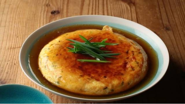 浇在鸡蛋豆腐上,再放几条葱点缀即可。