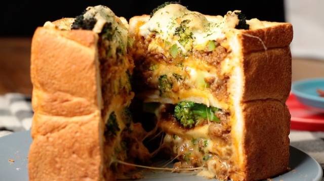 3.把挖出来那块切成三片,然后用擀面杖压平。然后把炒好的肉馅放进去,再加点西兰花、芝士后,放入擀好的面包片,依次叠放3层。