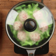 2.揉几个小肉球,在饺子皮上滚一下,然后放进铺好一层卷心菜的平底锅内,倒点水就可以盖上盖子加热啦。