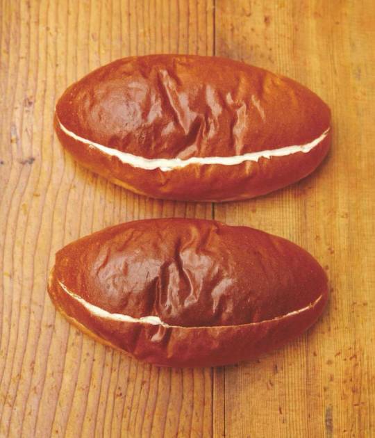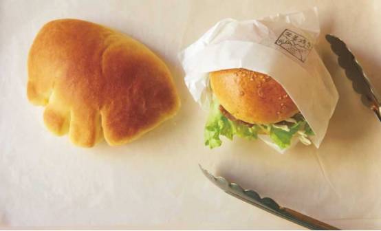 这家店创建于明治23年,曾经是和菓子店,后来转变为面包店,至今有21年了。店内的招牌面包是类似手掌形状的奶油面包(左),即使是工作日,也能每天卖到300个以上。另一个人气产品则是“神乐坂汉堡”(右),微甜的面包与酱油味的肉饼很搭。
