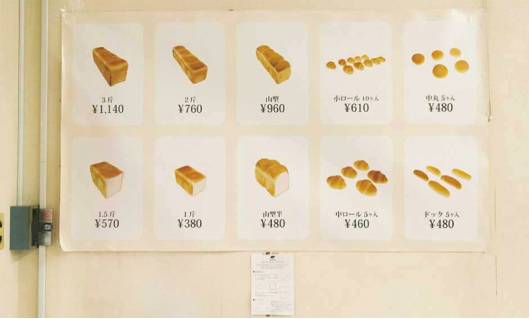 所有的商品都在图上。两种面包,根据大小不同定价也不一样。 第四代店主渡边陆虽然年轻,但背负着老店的招牌和名声,每日在准备功夫上不敢偷一点闲。“虽然一开始便有开面包店要靠体力的觉悟,但实际上工作的强度比想象中的还大。然而,每日的平凡工作却也有乐趣。”对于他来说,这家店既是名店,店里的面包味也是他自小便熟悉的爷爷的味道。他的工作除了每日不断烤面包,也有对传统的继承和保护。