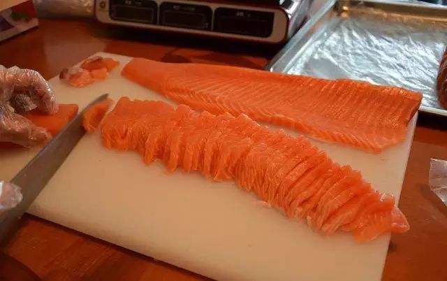 于是,自助餐台前面,排长队的,一定是在等三文鱼。师傅每切出一大盘三文鱼,马上就被排队的人瓜分了。