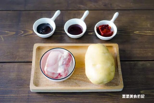 3.土豆切厚片,五花肉先切长段,再切成5mm左右的薄片。