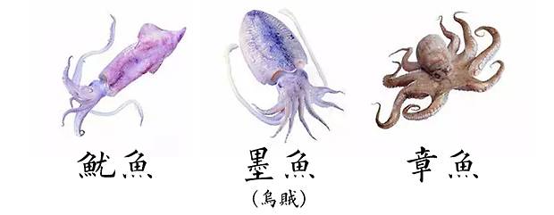 章鱼,又称八爪鱼;墨鱼,又称乌贼、花枝;鱿鱼,又称枪乌贼。三者都属于头足纲(Cephalopoda),身体可分为头部、足部和胴部。其中胴部就是外套膜,有三种形态,章鱼是球形,乌贼是袋形,而鱿鱼是锥形章鱼、乌贼鱿鱼在外形上的区别首先是外套膜