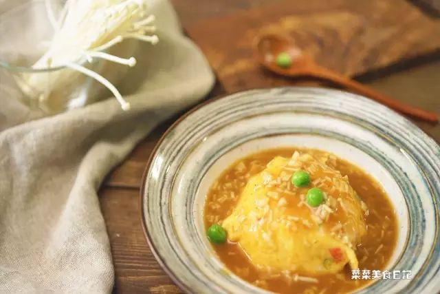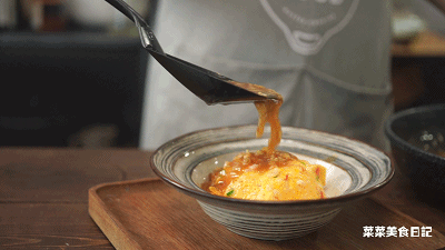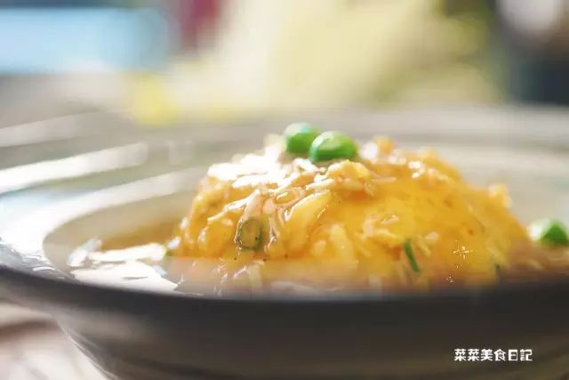 正宗的天津饭是酸甜口味的,会在酱汁里加糖和醋。可菜菜不想遮盖蟹虾的鲜美,所以没加了。