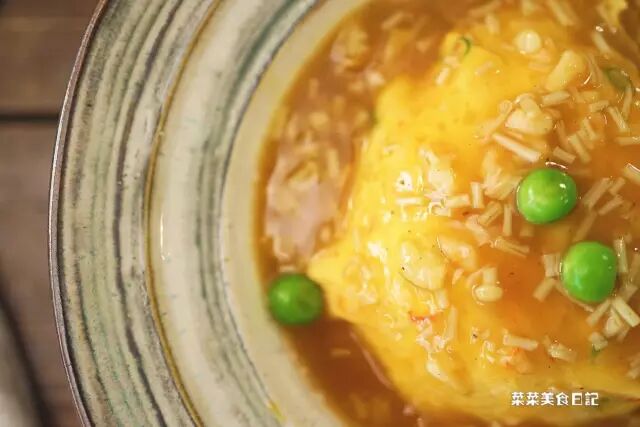 蟹肉、虾仁加入鸡蛋,摊成嫩嫩的蛋饼,盖在热腾腾的米饭上,再浇上厚厚的芡汁,用勺子挖着吃。