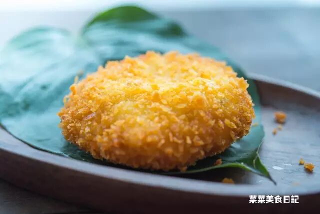鸡胸肉切块,马蹄切丁,一起搅碎后放入淀粉拌均,拍成饼状,裹上打散的蛋清,进面包糠里滚一圈后下锅油炸至表皮金黄,就可以开动了。