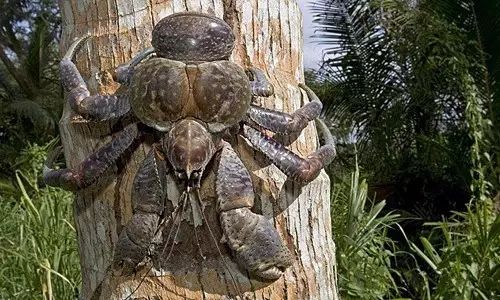 椰子蟹其实也是一种寄居蟹,和很多寄居蟹不同,这货已经适应了在陆地上的生活,在水里待太久反而会被淹死。椰子蟹形状很像短尾蟹类,椰子蟹体型硕大,体重可达到6千克,其外壳坚硬,有两只强壮有力的巨螯,还会爬树,尤其善于攀爬笔直的结有椰子的椰子树。而它们也可以用强壮的双螯剥开坚硬的椰子壳,然后吃掉里面的椰子果肉。