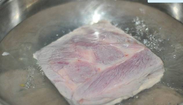 五层三花肉放入煮锅中,加入足够冷水,大火烧至断生,用筷子能扎透则起锅。