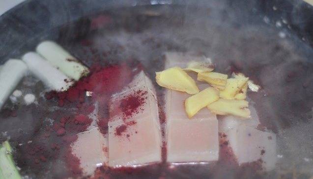 砂锅中用生姜垫底,将切好的肉皮向上放入锅中,加入热的五花肉汤、打结的香葱、老姜、绍兴黄酒、红曲米,加盖用中火加热30 分钟;