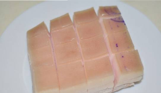 将五花肉肉皮向上放在案板上,用刀每隔1.5cm 剞一刀。然后垂直刚才的刀痕,再每隔1.5cm 剞一刀,剞的深度要深入第一层瘦肉。