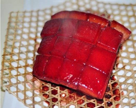 选择一尺见方的五层三花肉,同香料一同下锅煮,煮到用筷子一扎,肉能咬住筷子又能扎透就可以起锅。煮完之后再切上十字花刀下锅蒸煮,让肉做到软而不烂,保持大块肉的形状。完了再把猪肉的香料勾芡打上一层糖醋汁这道菜就算完成了。老饕吃货不用吃到肉光看到服务员把肉端上桌时肉自身的晃动就能判断出这樱桃肉够不够火候。