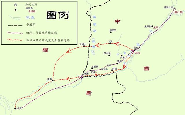 人们熟悉,第二次世界大战期间,中国东南沿海均被日军占领,为保障对西南后方的军火物资支援,盟军从印度东北部阿萨姆邦雷多小镇建立基地,经密支那将大批军火物资源源运入云南,这条通道称作“史迪威公路”,和当年英印当局欲建之路基本一致。从更早的历史上看,连通中缅的道路共有两条大的路径:一条是旱路,从缅甸都城曼德勒出发,经兴尼到永昌府(今保山市)和大理府;另一条是水路,由伊洛瓦底江北上到八莫(又译新街),再分成三个方向:北路前进到盏达(今盈江县),称盘岭路,中路到南甸(今梁河县)或户撒(今陇川县),因为是缅甸使臣走的道路,故亦称“使路”,南路又称撒瓦底路,也通向南甸。这三条支路均要经过克钦人(中国称景颇族)居住的山地,最后在腾越厅(今腾冲市)会齐,再往东行,亦到大理。