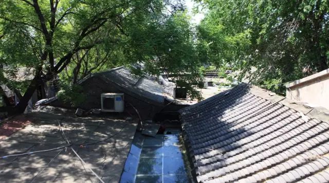 从八条一号二楼往外看,是非常经典的老城胡同屋顶,一片片的青瓦屋顶连着高大粗壮的槐树,下面是老张修建的玻璃花房,这是老张自己设计的。二楼修建已经有快10年的历史,2008年也没有判为违章建筑,不知道这次会命运如何。