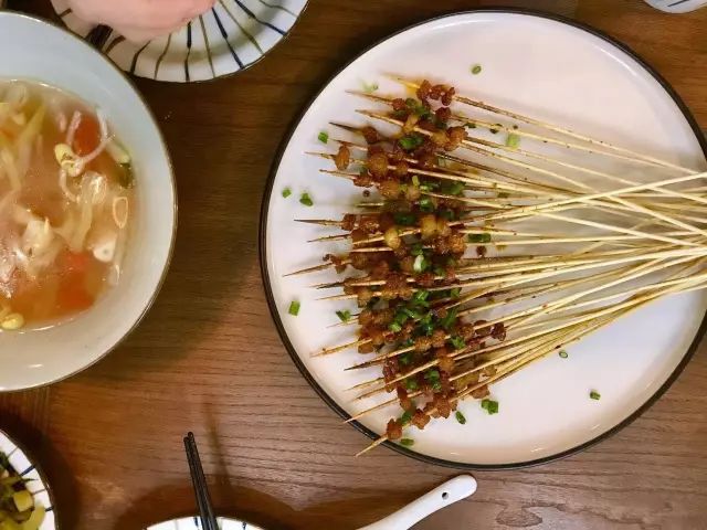 不过我所有的心神荡漾都在本场内测的主角——一盘烤牛油——上桌后戛然而止。滋滋的油光在餐厅的灯光下璀璨闪耀,我魂都没了!伸出一只爪子,拿了一串。不大,就3个迷你大小的油渣 。撒了香葱和辣椒面。一口下去,酥脆的“咯吱”声伴随着牛油在嘴里喷发。这是赤果果的酥香爆浆啊!我一口又一口,吃的幸福满足。S小姐无视的看着我,大抵是知道这个结果一定会发生。