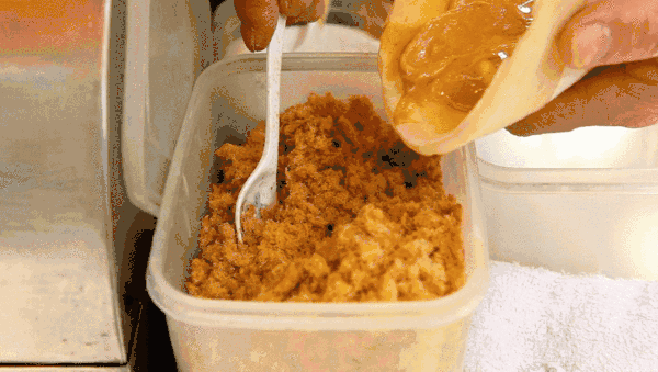 冷却后肉松手工用手与竹编壁刚柔摩擦,使肉质纤维更蓬松,肉松成形。